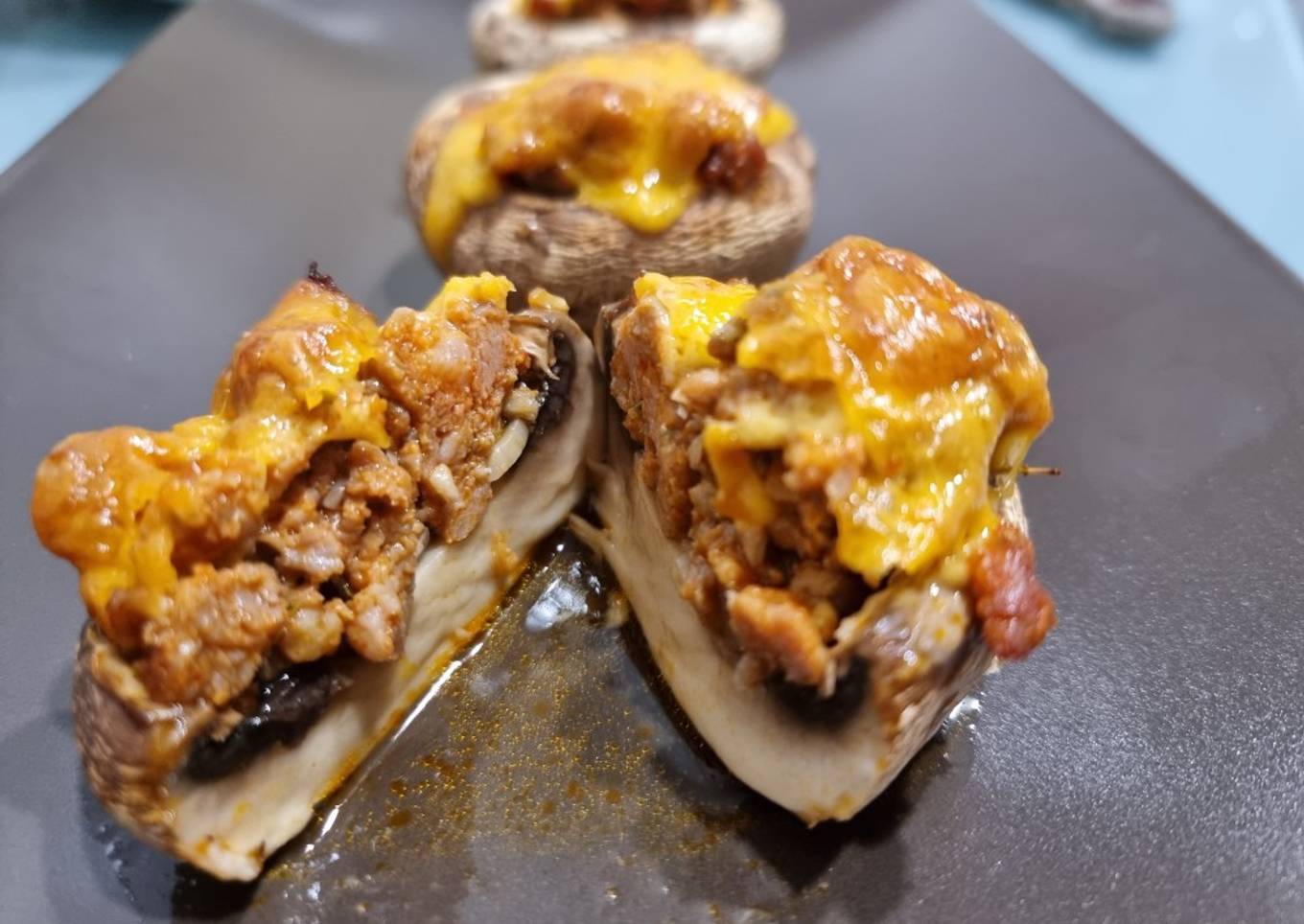 - Rellenamos los champis y ponemos un cuadrado de queso cheddar encima