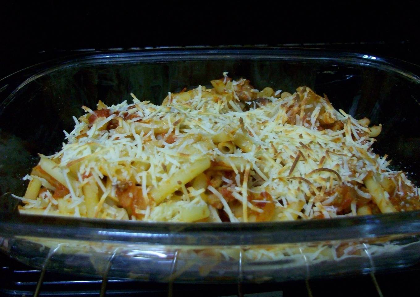 Macarranos gratinados con unas salsa de tomate con carne picada y queso rallado por encima