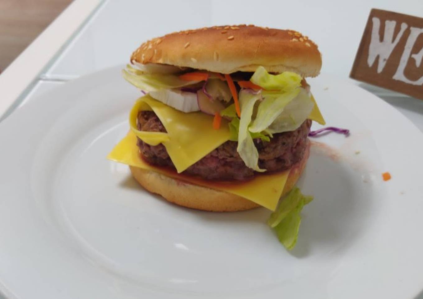 Hamburguesa de ternera con rulo de cabra y cebolla caramelizada