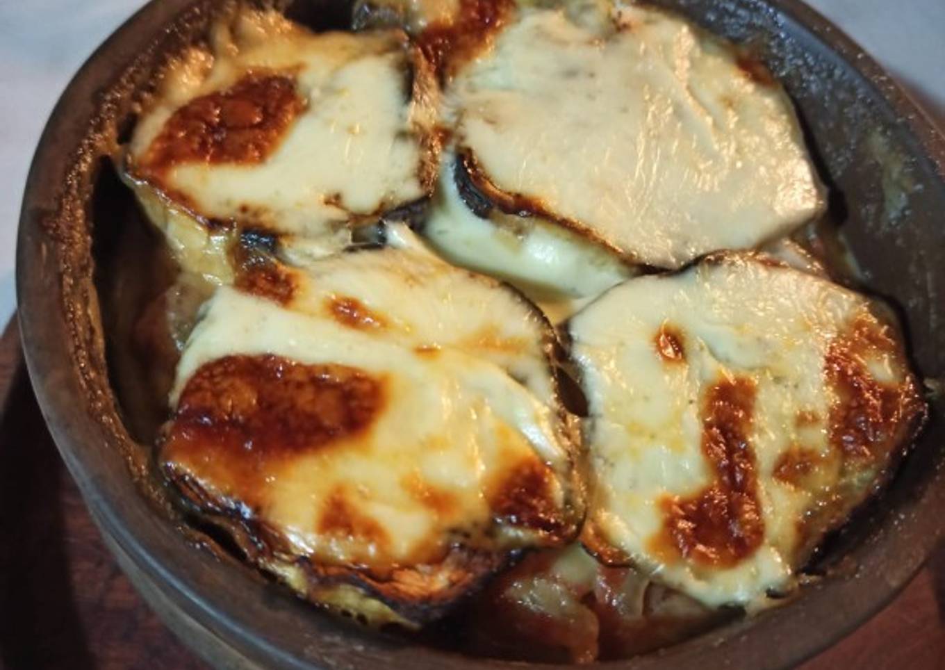 - Para el armado colocar un poco de aceite en las cazuelas, la berenjena luego relleno encima berenjenas, nuevamente relleno terminando con berenjenas.