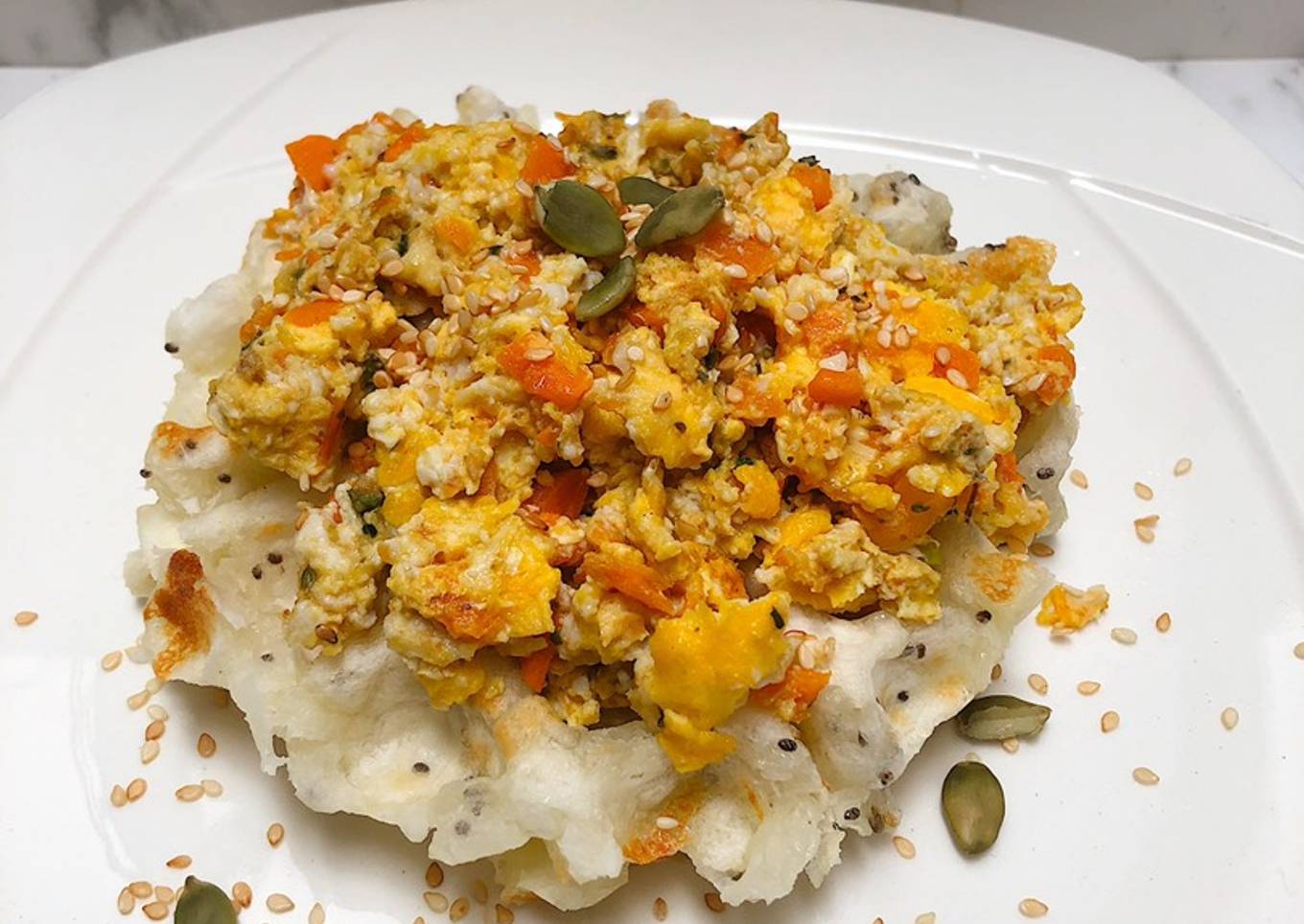- Servir el waffle y encima los huevos pericos 🍳. Disfrutar de esta delicia. No hay mejor forma de empezar el día que con un buen desayuno 🤤